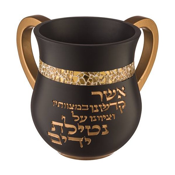 נטלה כשרה עשויה פולימר איכותי בגודל 14 ס"מ, בעיצוב מרשים המשלב גוון שחור עמוק עם ידיות זהב ופס דקורטיבי מוזהב במראה פסיפס.