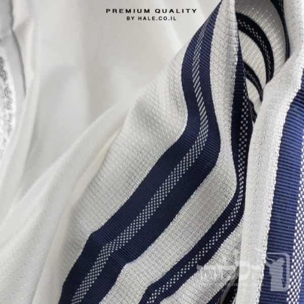 טלית דגם 61040 משלבת פסים בכחול כהה במראה אלגנטי ונקי, המתאים במיוחד לחתן ביום החופה וגם לתפילות שבת וחג.